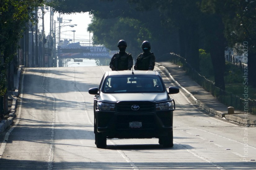 Patrulla militar realizando un recorrido para asegurar el cumplimiento del toque de queda, trae a la mente los tiempos de conflicto armado interno cuando las fuerzas de seguridad deambulaban por las calles. / Military patrol conducting a tour to ensure compliance of the curfew. This image brings to my mind times of the internal armed conflict when security forces roamed the streets.