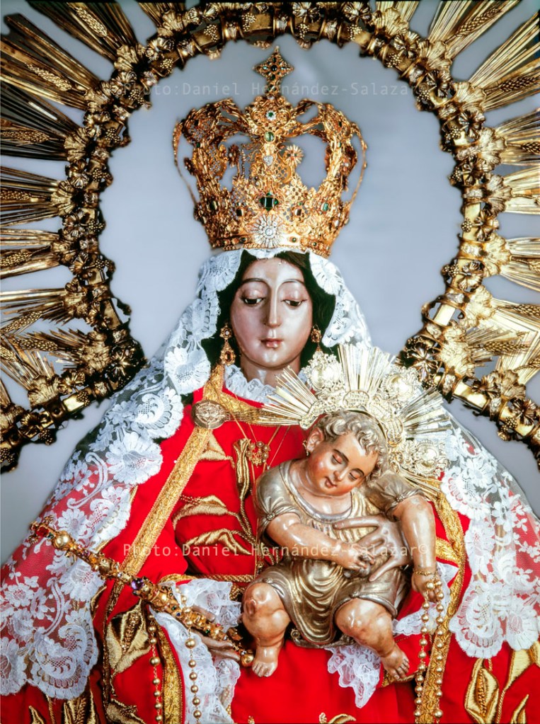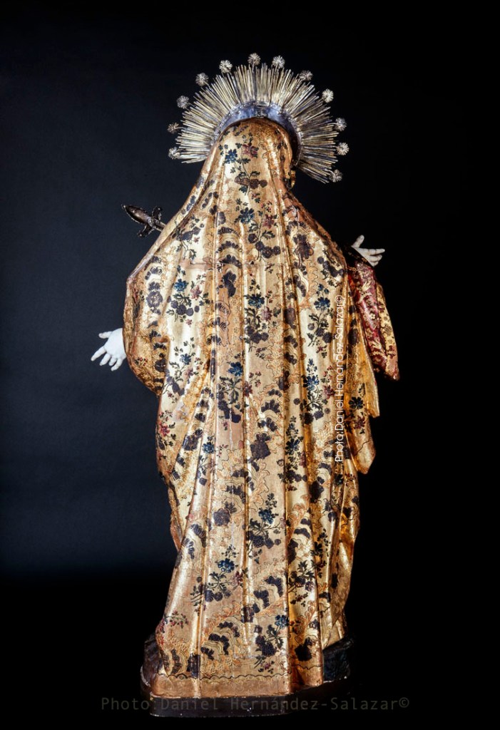 Virgin of the Rosary. Cast in silver in 1580 and restored by Joseph Cornelio de Lara, in 1774 after being destroyed by the 1773 earthqake. Santo Domingo Basilic, Guatemala City. / Virgen del rosario. Fundida en plata en 1580 y restaurada por Joseph Cornelio de Lara, en 1774 después de la destrucción sufrida en el terremoto de 1773. Basílica de Santo Domingo, Guatemala.